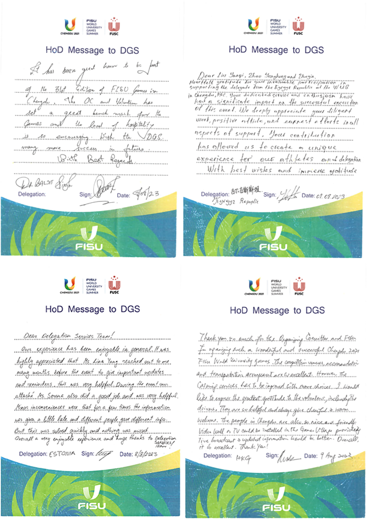 随着大运会的落幕,BG大游集团国际代表团服务团队凭借着及时高效的响应速度、热情专业的接待能力,取得了上百个代表团的盛赞,并收到了近70封代表团团长亲笔手写的表扬信。他们感谢代表团服务团队的工作,感谢3年来的沟通和10多天的陪伴,更感谢把他们当做朋友,与他们共同庆祝代表团取得的成绩。